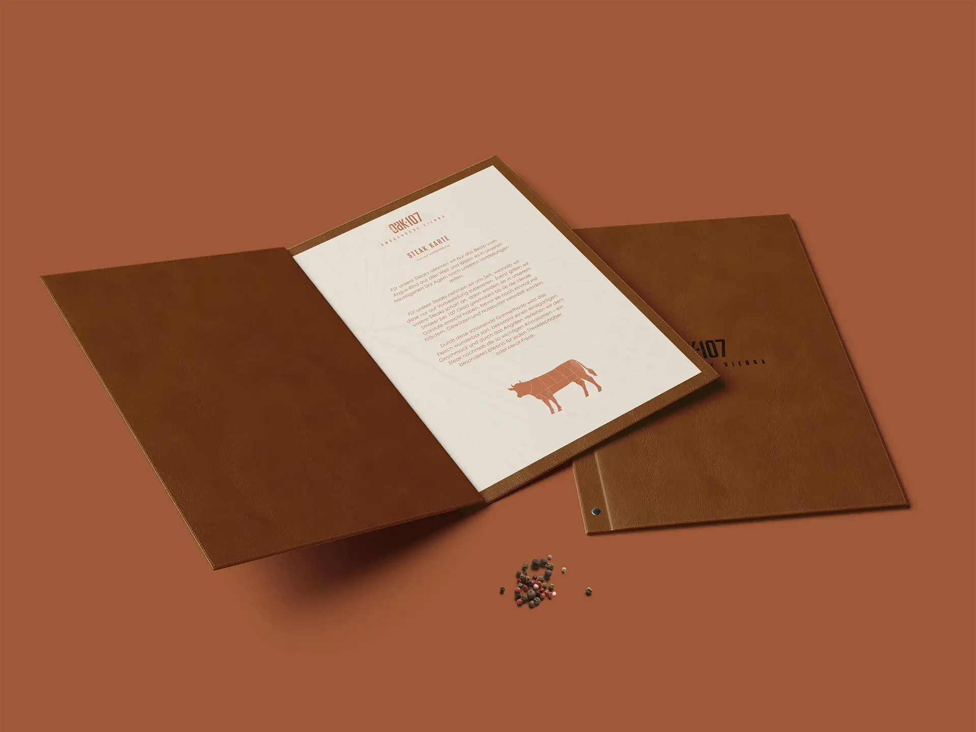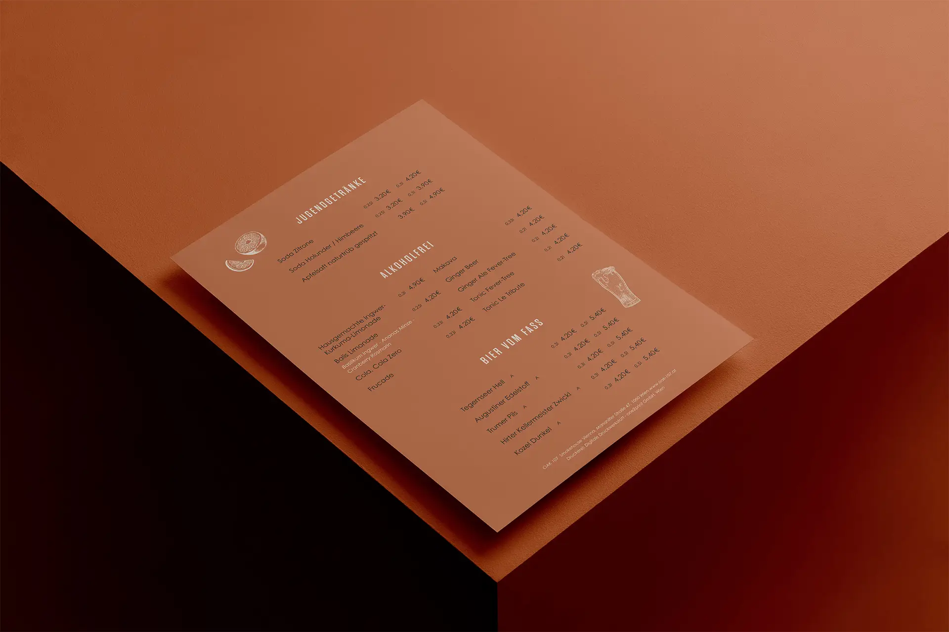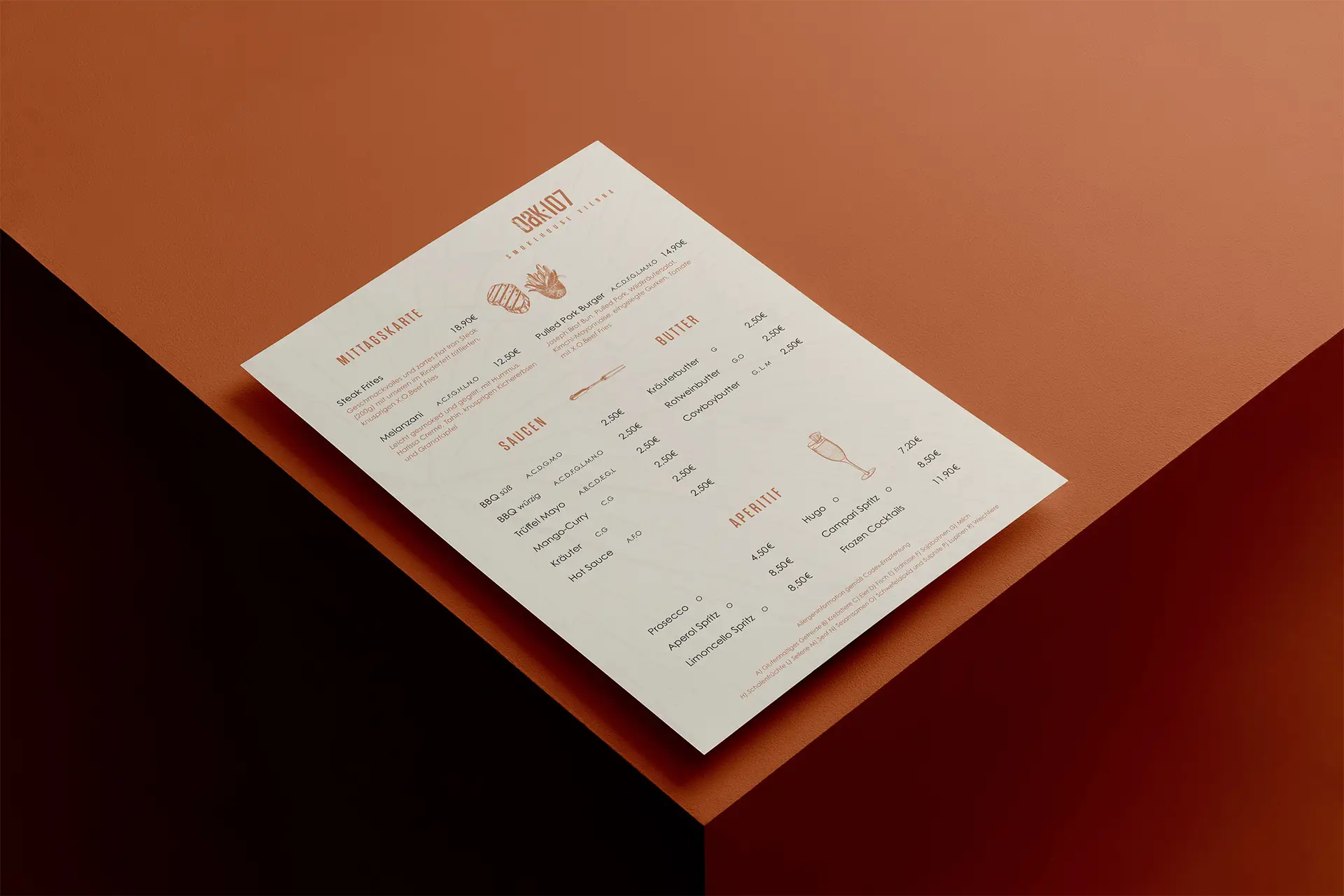 Anfang 2023 wurde das Wiener Szenelokal Oak107 mit neuen Speisekarten ausgestattet. Im Zuge der Neugestaltung wurden vier neue Speisekartenformate (Abend-, Mittags-, Steak- und Dessertkarte) und diverse Illustrationen ausgearbeitet.